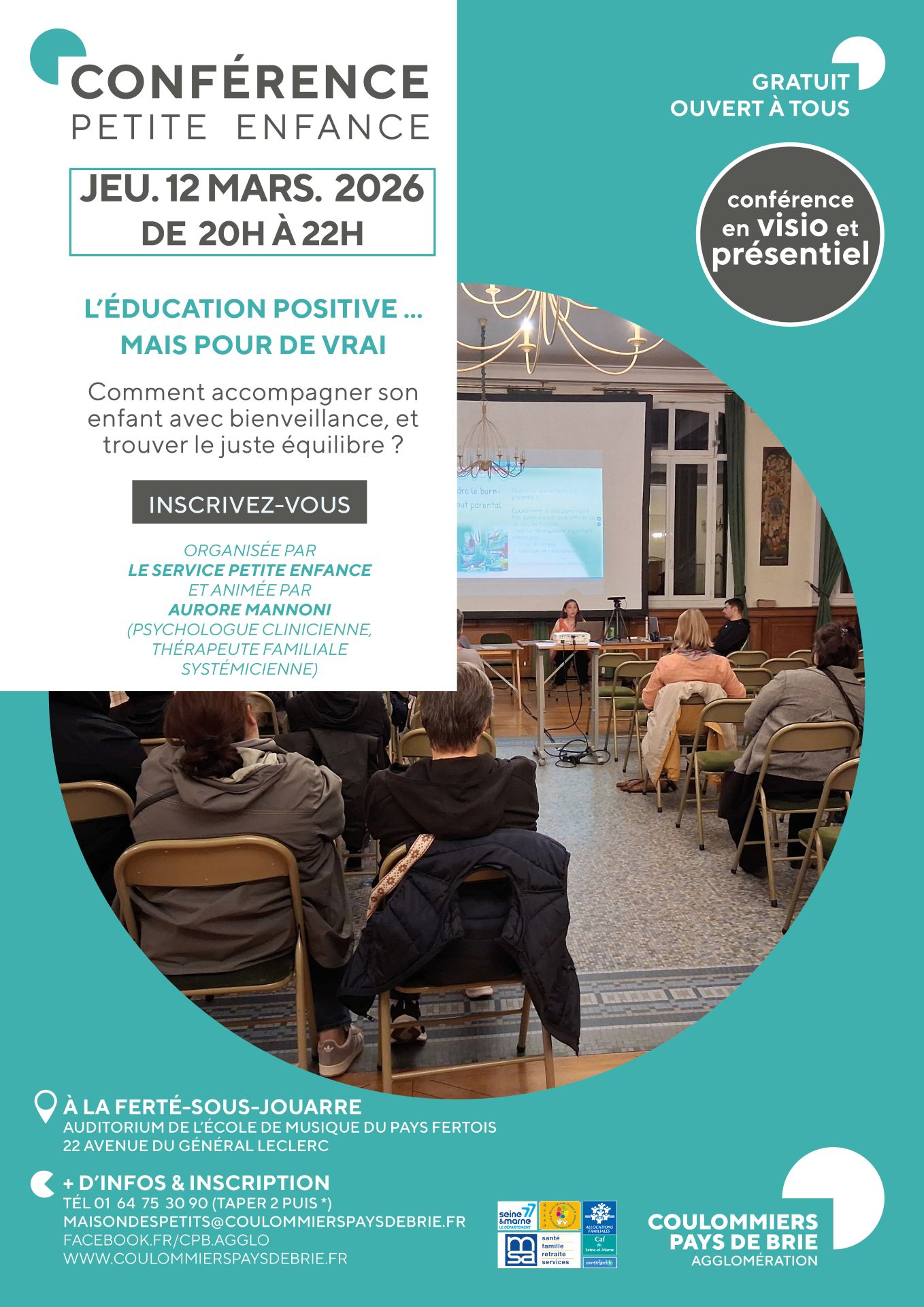 Cette conférence est organisée par le service petite enfance de la communauté d’agglomération Coulommiers Pays de Brie et animée par Aurore Mannoni, psychologue. Elle a pour but de vous informer sur comment accompagner son enfant avec bienveillance, et trouver le juste équilibre.