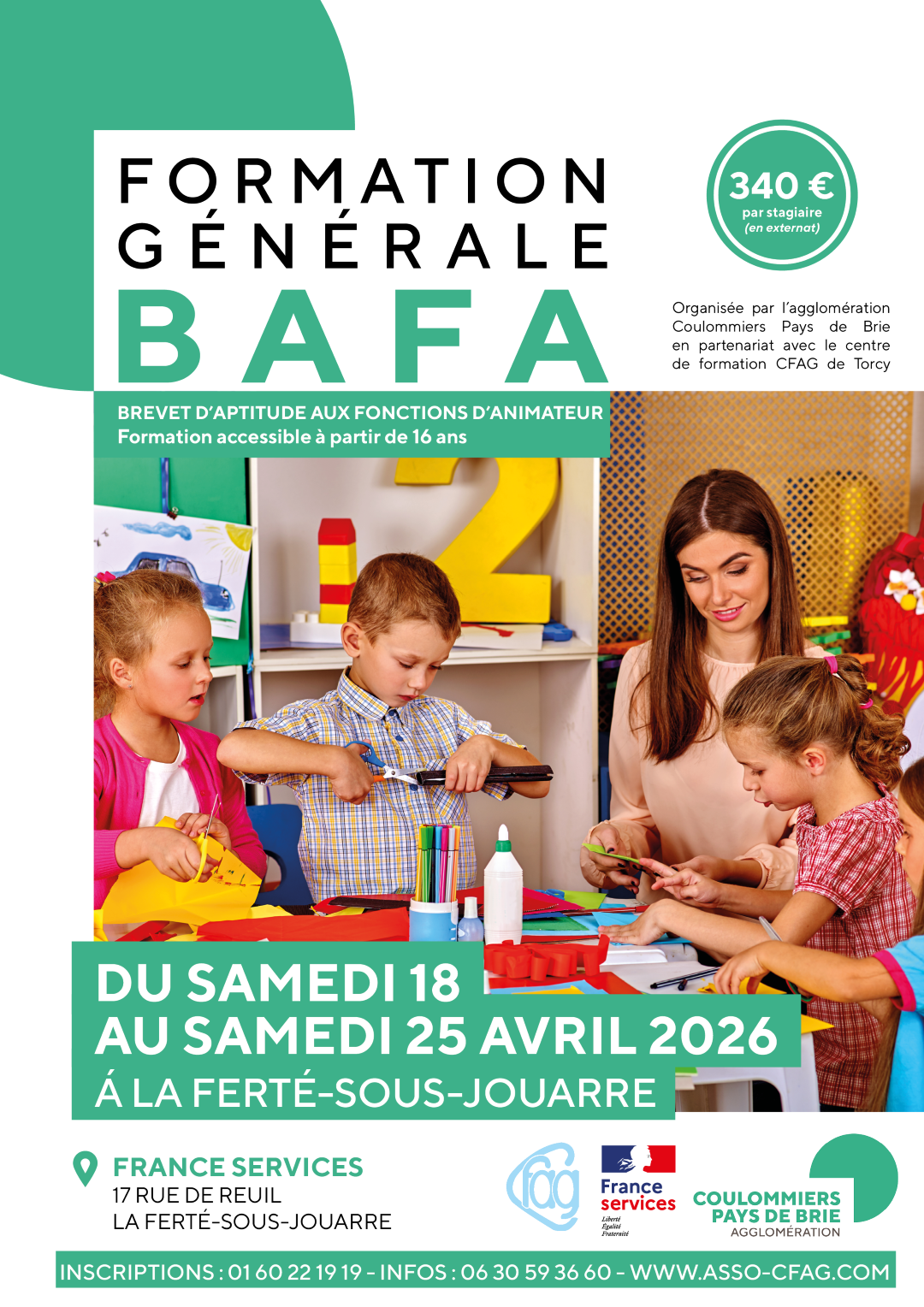 La communauté d’agglomération Coulommiers Pays de Brie (CACPB) organise, en partenariat avec le Centre de Formation d’Animateurs et de Gestionnaires (CFAG), une session de formation générale pour l’obtention du brevet d’aptitude aux fonctions d’animateur d’accueil collectifs de mineurs (BAFA) du samedi 18 au samedi 25 avril 2026 à la Ferté-sous-Jouarre en externat.
